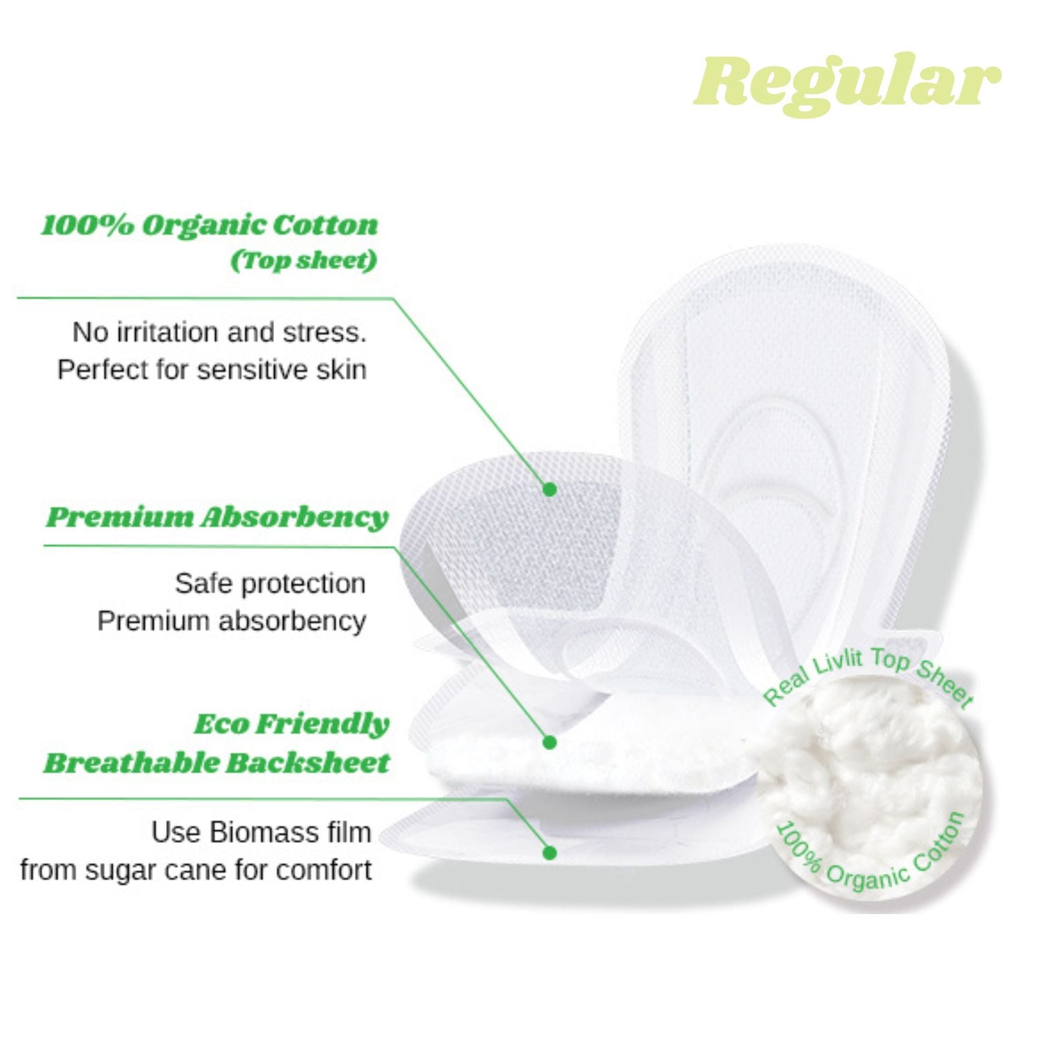 Made With- 100% organic cotton (topsheet), 100% cotton (wings), Premium Absorbency (core), 100% eco-friendly biomass film (backsheet)